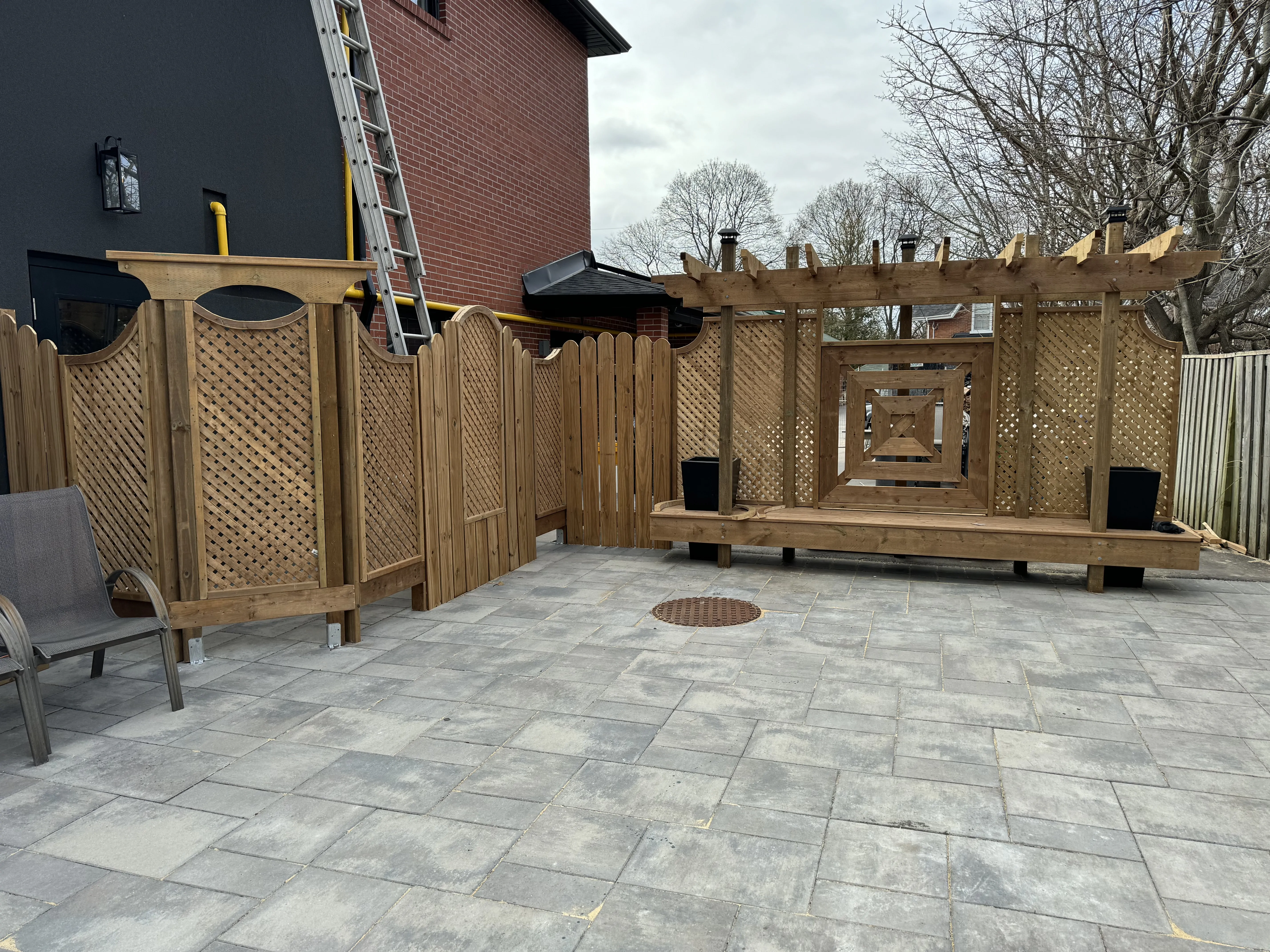 Custom pergola structure with decorative framing and privacy lattice screens to define an outdoor living space in Bowmanville, ON.